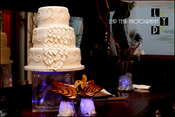 The wedding  reception took place inside the Burroughs home with the wedding dance on the giant outdoor porch. Peacock feathers were the thematic element used in the brides bouquet and hair, centerpieces, and was carried through to their beautiful wedding cake too, as seen below.