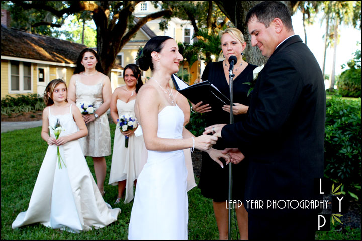 Janine and Kurt’s wedding ceremony took place under the picturesque live oaks on the waterfront of the Caloosahatchee River. While I’ve photographed many weddings where there was no seating provided, this one was one of a few where the seating wasn’t used at all — they had a standing ovation for the entire ceremony!  And why not? Janine and Kurt were a great bride and groom deserving of celebration on their fantastic wedding day.